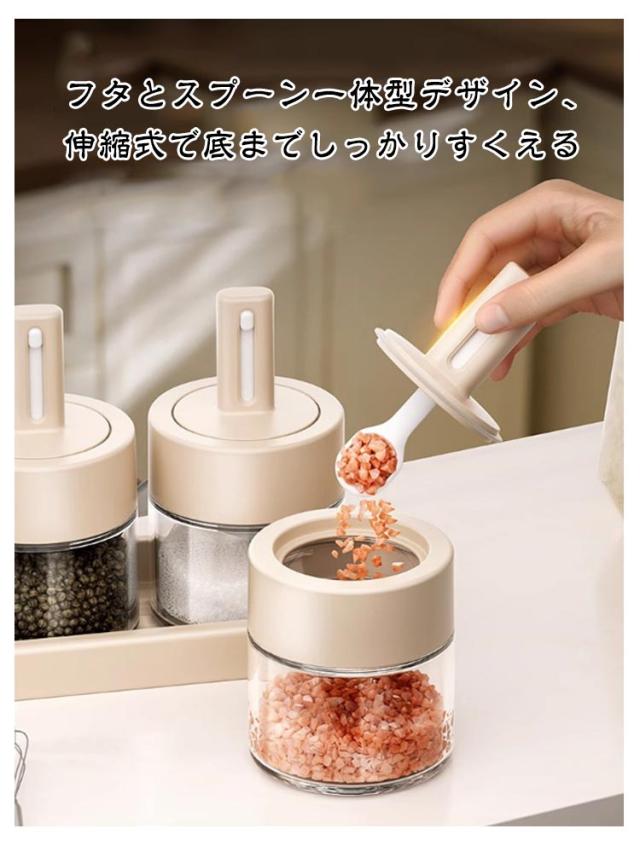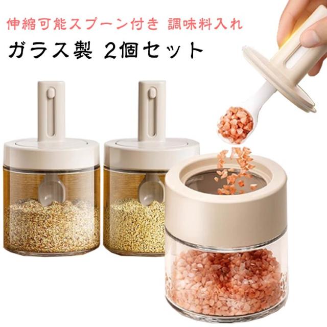 伸縮スプーン付き 調味料容器 調味料ポット ガラス製 大容量 調味料入れ スパイス入れ キッチンポット 調味料ケース 保存容器 密閉保存 湿気防止 使いやすい 2個セット
