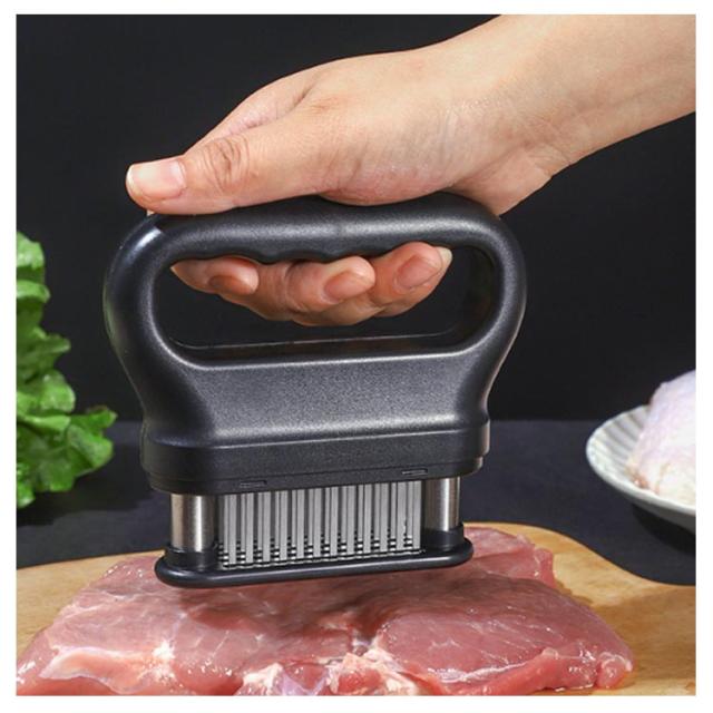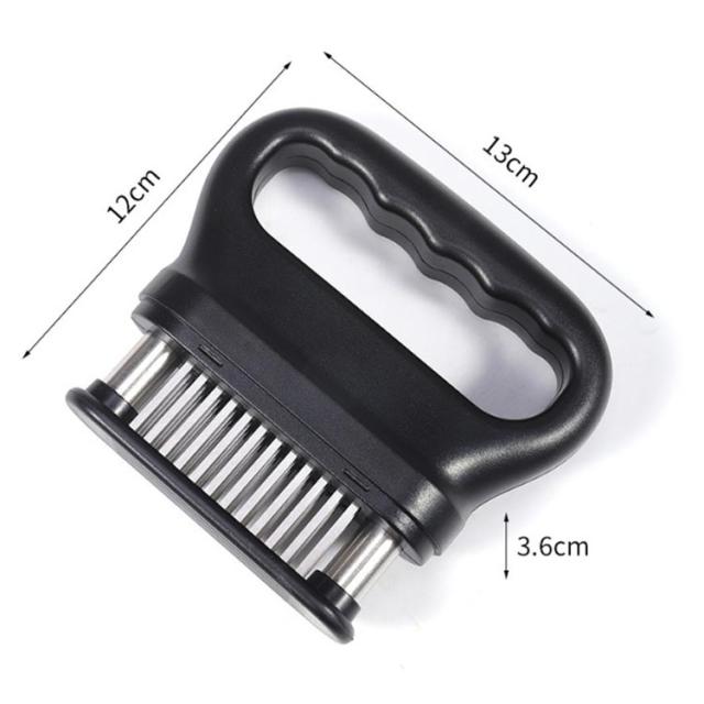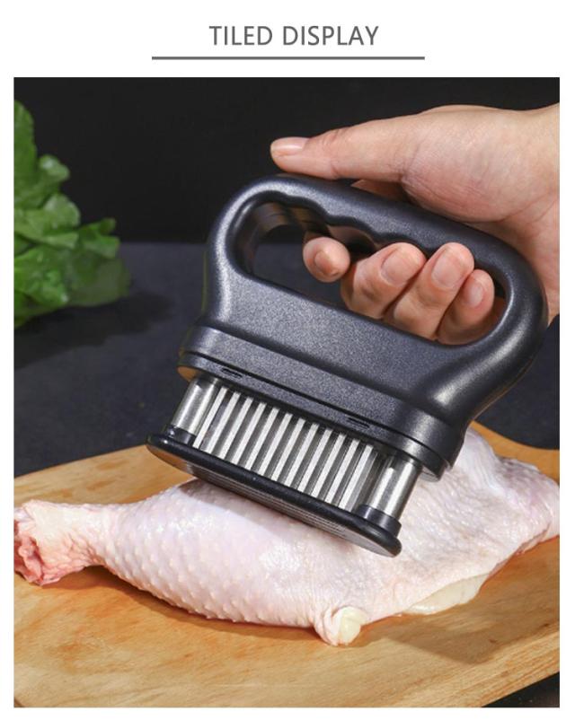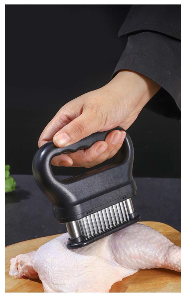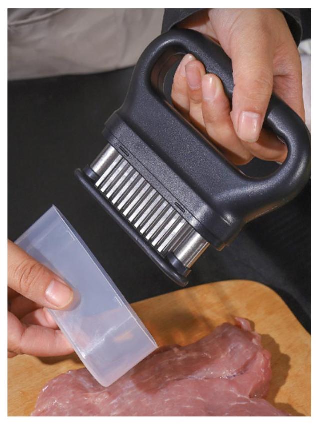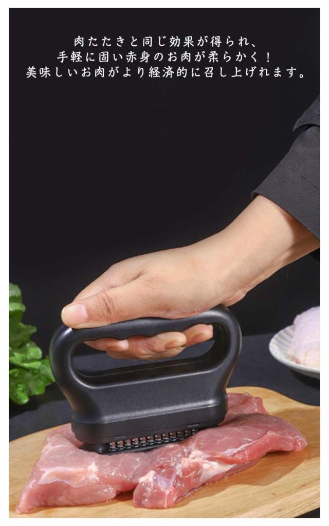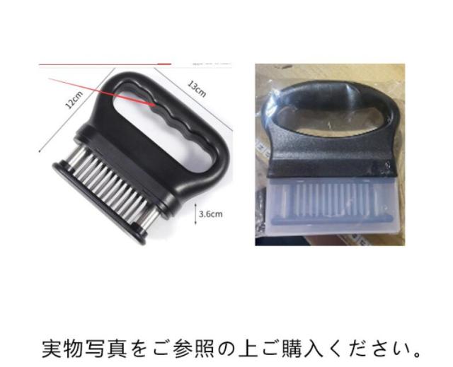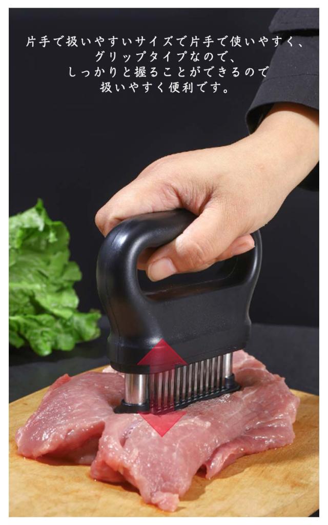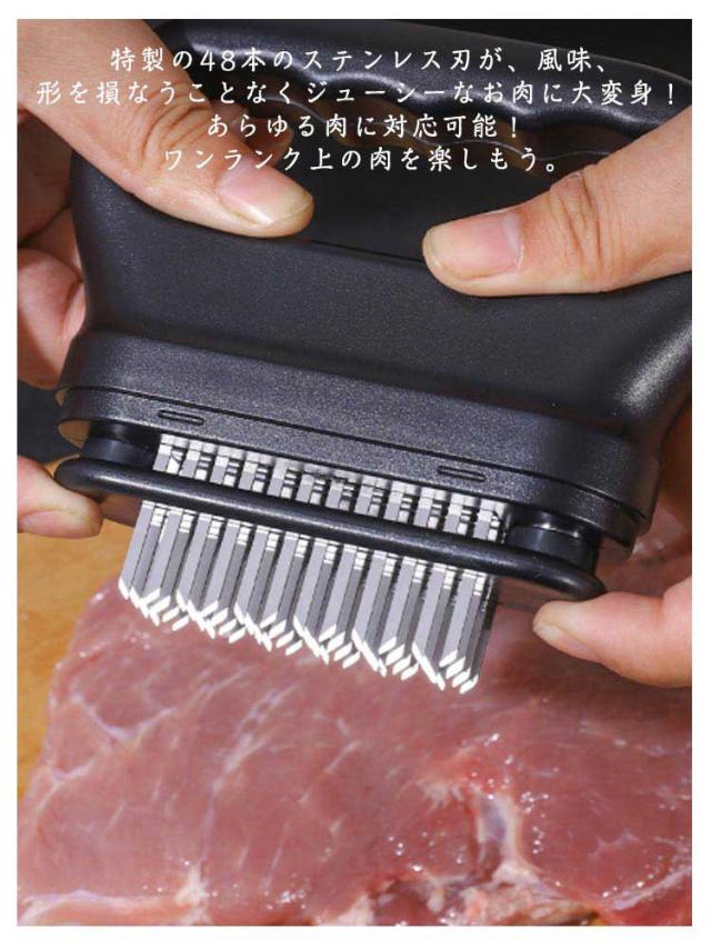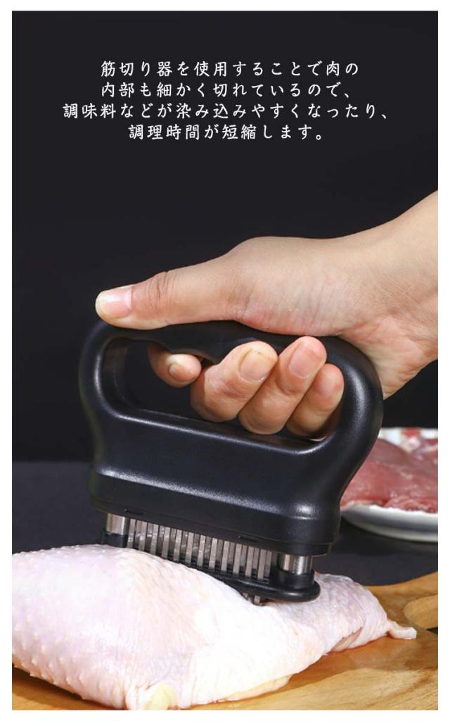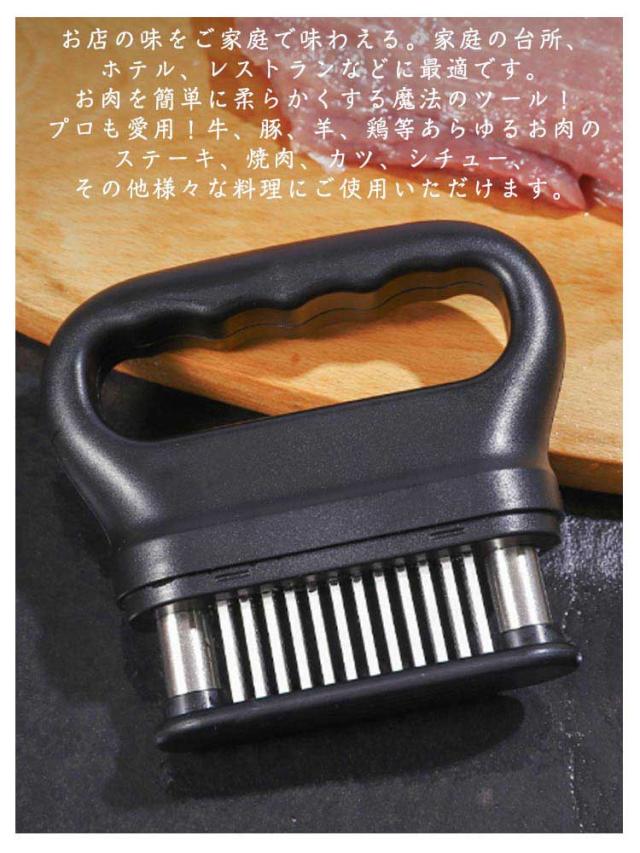| お店の味をご家庭で味わえる。家庭の台所、ホテル、レストランなどに最適です。お肉を簡単に柔らかくする魔法のツール!プロも愛用!牛、豚、羊、鶏等あらゆるお肉のステーキ、焼肉、カツ、シチュー、その他様々な料理にご使用いただけます。 肉たたきと同じ効果が得られ、手軽に固い赤身のお肉が柔らかく! 美味しいお肉がより経済的に召し上げれます。 特製の48本のステンレス刃が、風味、形を損なうことなくジューシーなお肉に大変身! あらゆる肉に対応可能!ワンランク上の肉を楽しもう。 筋切り器を使用することで肉の内部も細かく切れているので、調味料などが染み込みやすくなったり、調理時間が短縮します。 片手で扱いやすいサイズで片手で使いやすく、グリップタイプなので、しっかりと握ることができるので扱いやすく便利です。 取り外しも簡単!刃の間に残った肉の繊維などもきれいに洗浄でき、いつでも清潔にご使用いただけます!使用しないときは専用のケースにしまっておけるので収納時も安全です。 | |