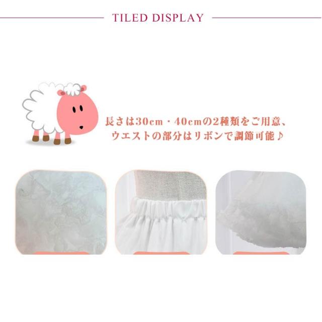 | ふんわりふわふわでとってもガーリー!大人気のプリンセスチュチュスカートです。 長さは30cm・40cmの2種類をご用意、ウエストの部分はリボンで調節可能♪ チュールの素材を見直して、小さなお嬢様にも安心な、ごわごわしにくい ソフトチュールを採用。 このままスカートとしても可愛いですが、ドレスのパニエとしても使えるので1着持っていると便利です。 発表会・結婚式・お誕生日会・記念撮影や衣装、やパーティ、そして、普段使いにもおすすめ♪ | |