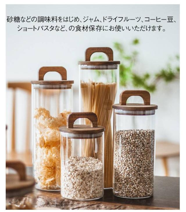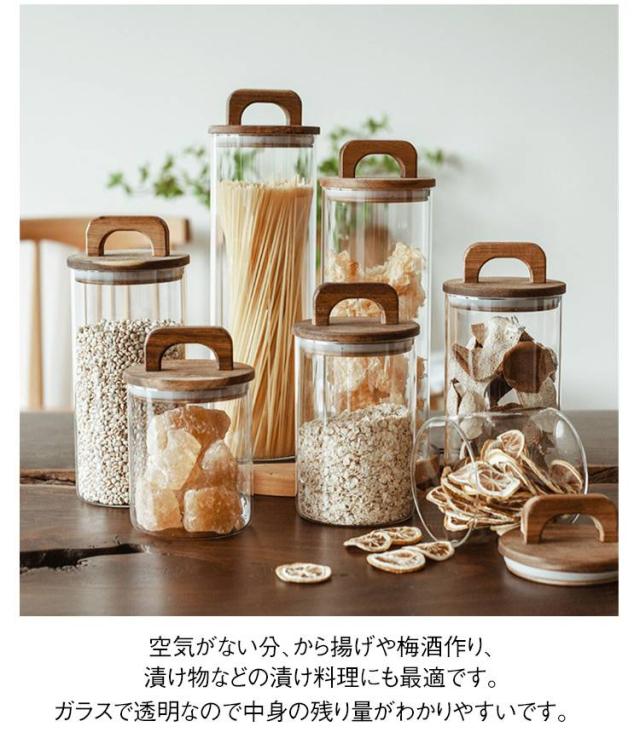 | 【木製フタ付き ガラス保存容器 2個セット 7サイズ】 特殊なフタで空気を抜いて長期保存ができる~おしゃれなキャニスター 密閉度が高いため、湿気を嫌う茶葉やパスタ、コーヒー豆が傷みにくく長期保存にもオススメです。 空気がない分、から揚げや梅酒作り、漬け物などの漬け料理にも最適です。 ガラスで透明なので中身の残り量がわかりやすいです。 ガラス製なのでにおい移りや色移りの心配もなく、見た目がすっきりして冷蔵庫の中でも中身が一目瞭然です。 砂糖などの調味料をはじめ、ジャム、ドライフルーツ、コーヒー豆、ショートパスタなど、の食材保存にお使いいただけます。 お茶やコーヒーを何種類か揃えて、きれいにストックするのもいいですね。 | |