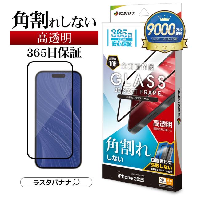 【送料無料】iPhone Air 17 Pro Max ガラスフィルム 全面保護 高光沢 高透明 クリア 角割れしない ソフトフレーム 0.33mm 硬度10H 貼り付けガイド枠付き アイフォン 保護フィルム ラスタバナナ SG4998IP5C SG5023IP5D