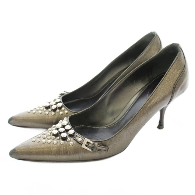 【中古】プラダ パンプス ポインテッドトゥ レザー スタッズ ビジュー装飾 ベルト 37 チャコールグレー