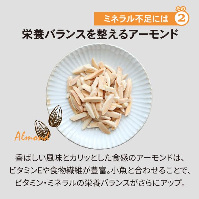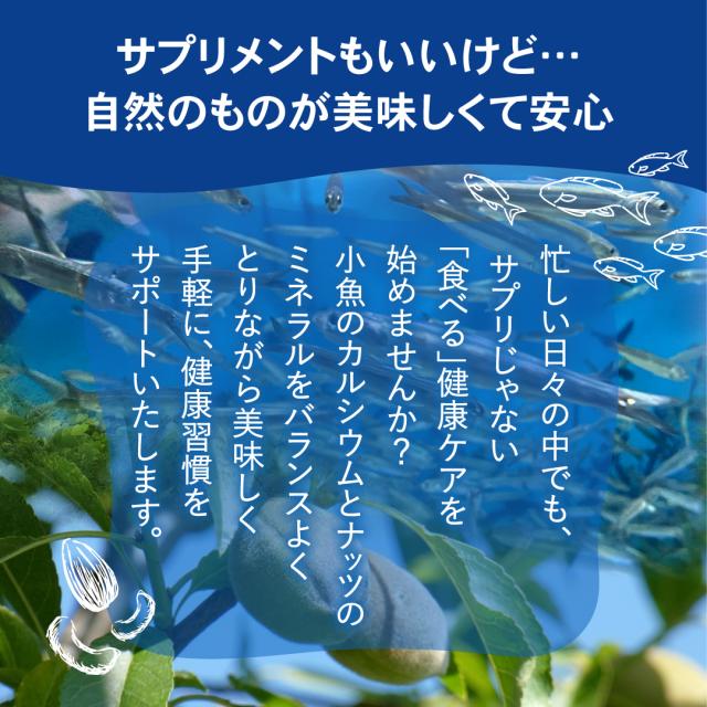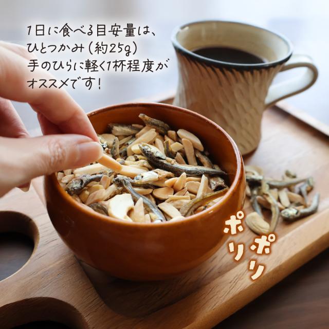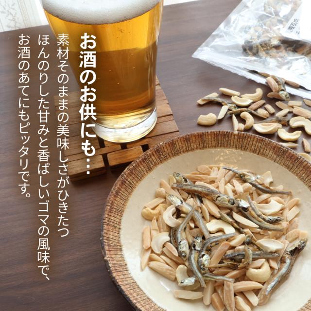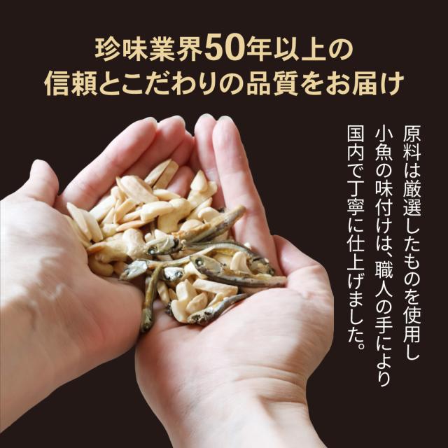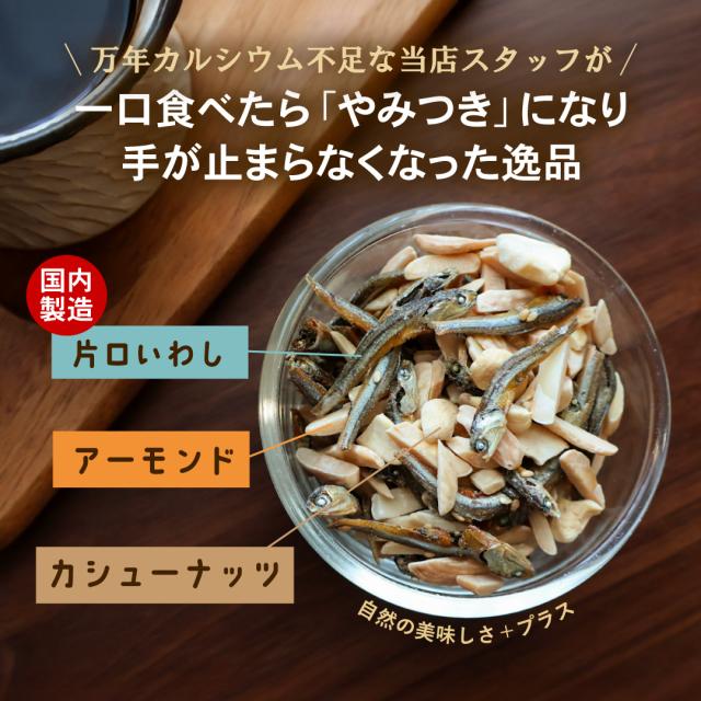 原材料:アーモンド(アメリカ)、味付煮干し(国内製造)、(煮干魚類(カタクチイワシ、食塩)、砂糖、ごま、水あめ、食塩、でん粉分解物)、カシューナッツ加工品(カシューナッツ、食塩)