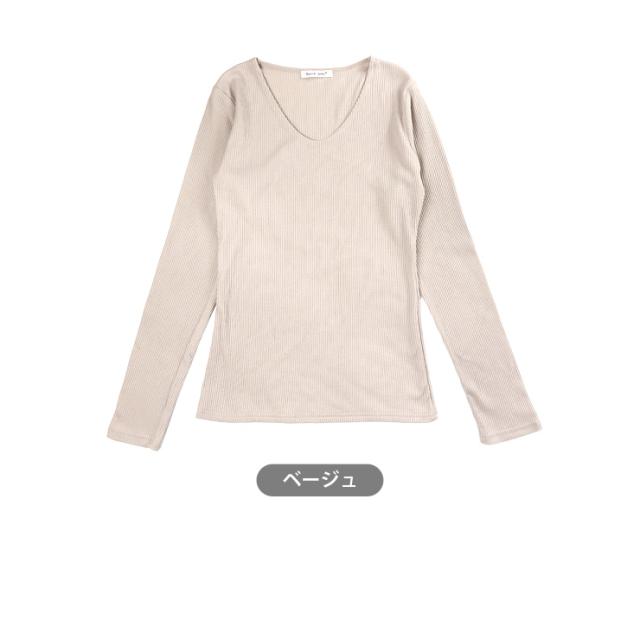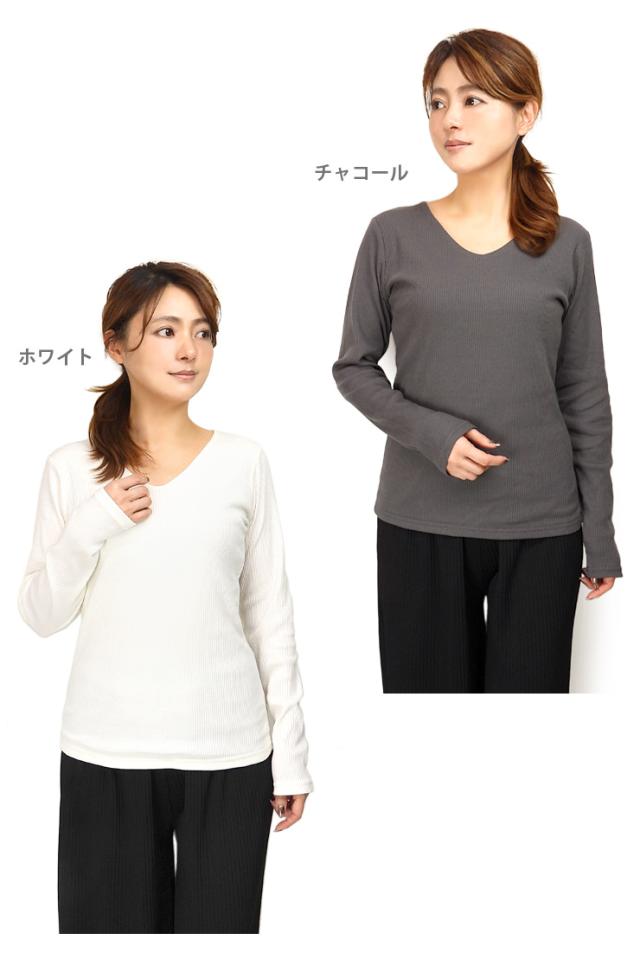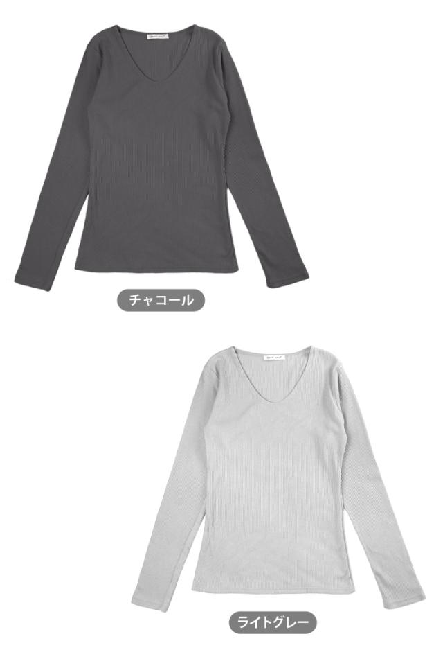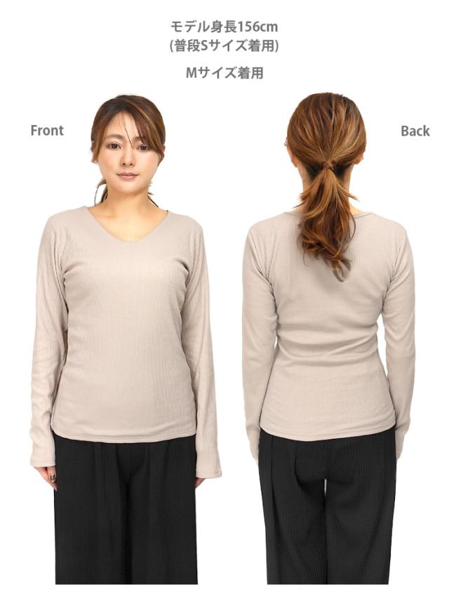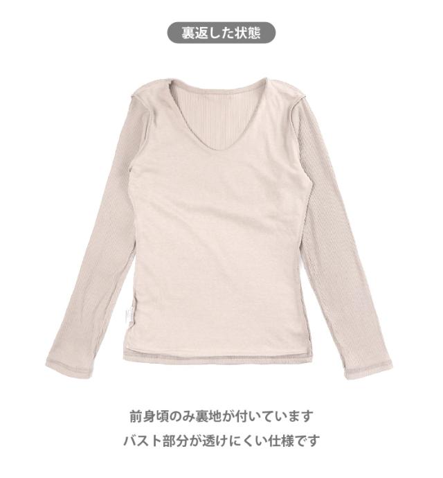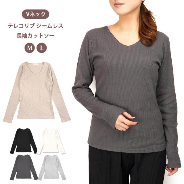 【メール便送料無料】Vネック 長袖 シームレス カットソー レディース M L 51690A ブラック ホワイト チャコール ライトグレー ベージュ テレコリブ 無地 トップス Tシャツ アンダー インナー 透けにくい 裏地付き 黒 白 茶 3018