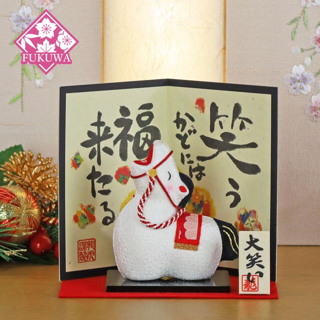 干支 置物 午 十二支飾り 干支の置物 十二支 かわいい おしゃれ 置物(大笑い 午 小 屏風付 R8-36-3) 日本製 正月飾り インテリア 陶器 コンパクト 小型 国産 日本土産 プレゼント 贈り物 リュウコドウ 馬