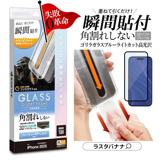 【送料無料】iPhone Air 17 Pro Max ガラスフィルム 全面保護 ブルーライトカット 高光沢 ゴリラガラス採用 貼付革命 貼り付け革命 瞬間貼り 失敗しない レボリューション 角割れしない ソフトフレーム 0.25mm 硬度10H アイフォン 保護フィルム ラスタバナナ MTK5008IP5C MTK5039IP5D