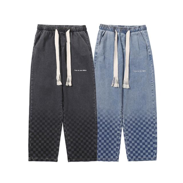 デニムパンツ メンズ ジーンズ ストレート グラデーション チェッカーボード柄 ポケット付き 体型カバー きれいめ カジュアル ワイドパンツ ロングパンツ ゆったり ファッション シンプル 大きいサイズ 春 秋 冬