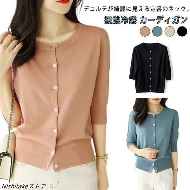 カーディガン 接触冷感 レディース 半袖 五分袖 羽織り 薄手 サマーニット ニットカーディガン カジュアル 大きいサイズ トップス 春夏 UVカット 通勤 丸首 夏 夏服 オフィス ニット 涼しい 無地 シンプ サマー カーデ 黒 UV 冷房対策