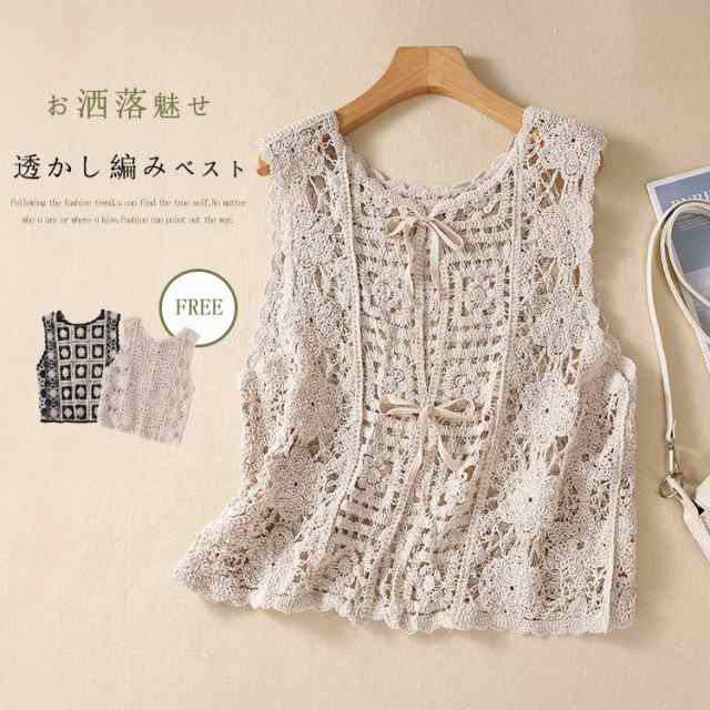 透かし編み ベスト レース レディース 春夏 ニット クロシェ編み トップス 春 夏 透かし編みベスト 大きいサイズ 透ける ジレ ニットベスト ショート丈 重ね着 コーデ かぎ編み 春ベスト ノースリーブ リボン サマーベスト