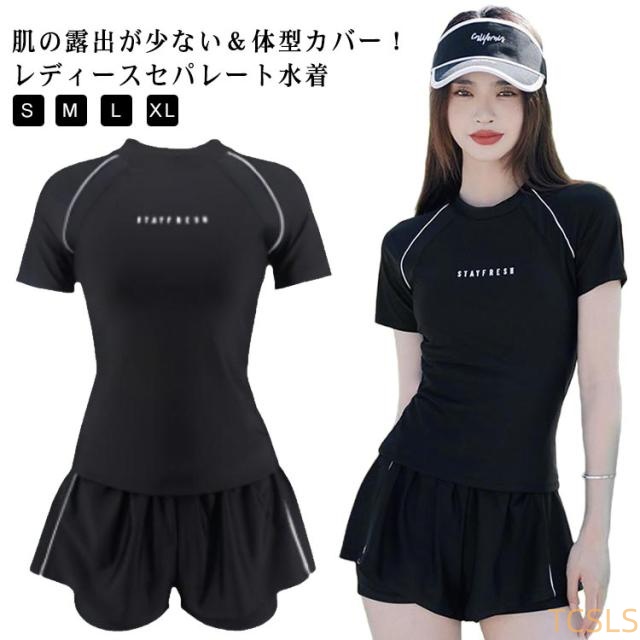 セパレート スクール水着 ショートパンツ 半袖 セパレート水着 セパレート水着 半袖tシャツ 女子 高校生 大学生 ママ水着 上下セット レディース 水陸両用 シンプル 体型カバー ストレッチ 伸縮 パッド付き フィットネス水着