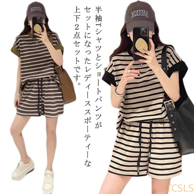 上下セット ショートパンツ2点セット 可愛い レディース ボーダー柄 夏 半袖 短パン セットアップ ストライプ Tシャツ tシャツ ルームウェア スポーツ 大きいサイズ 上下セット 着痩せ お呼ばれ お出かけ