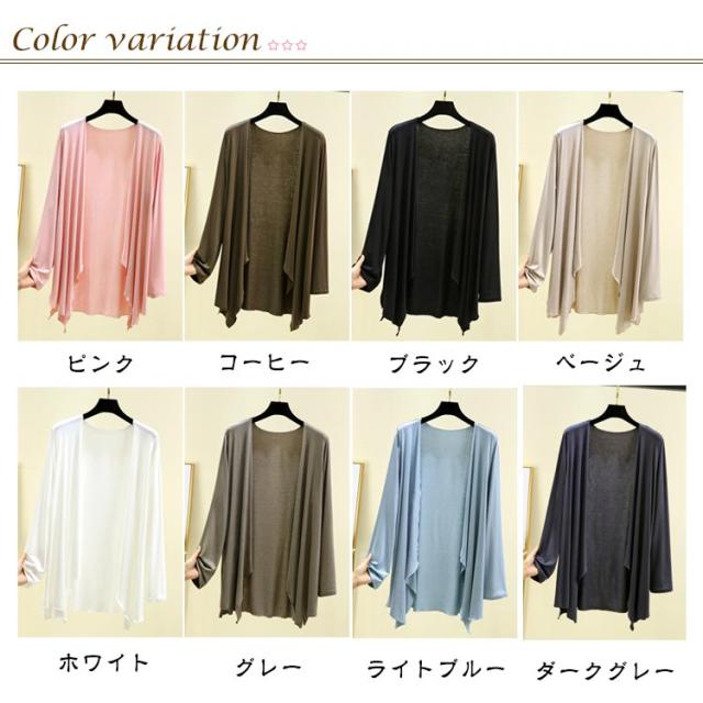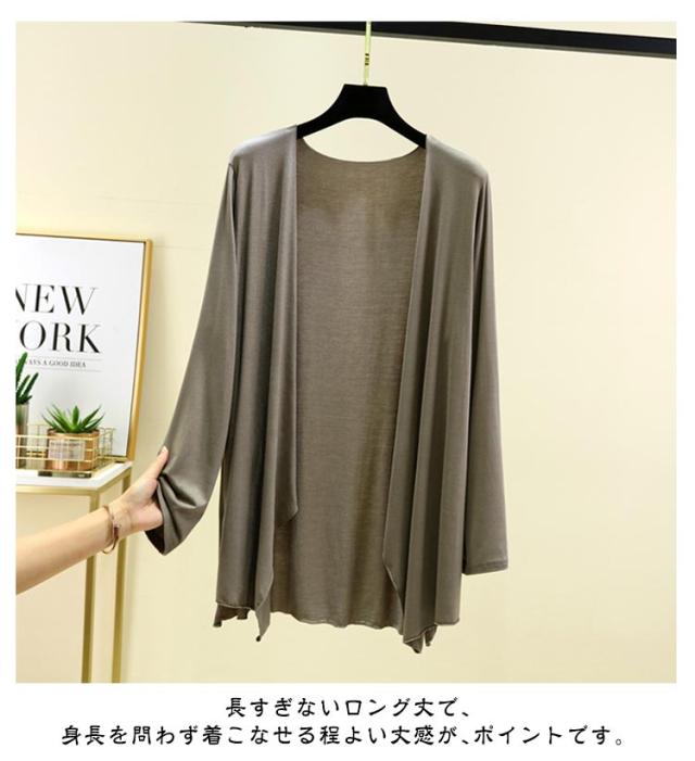 | 無地でシンプルなデザインがデイリー使いしやすいカーディガンです。 サラリとした質感のモダール生地を使用で、肌あたりも爽やかなUVカーディガン。 長すぎないロング丈で、身長を問わず着こなせる程よい丈感が、ポイントです。 薄手で軽やかな羽織心地は夏にもぴったり。日差し対策や、冷房対策など幅広く活躍します。 | |
