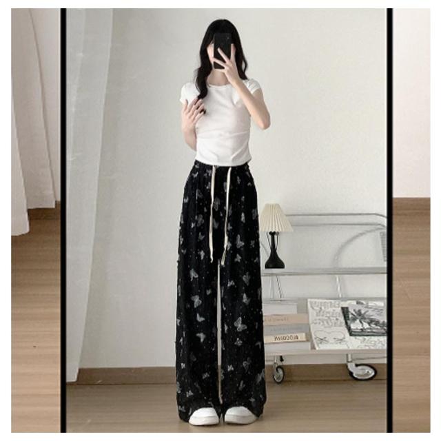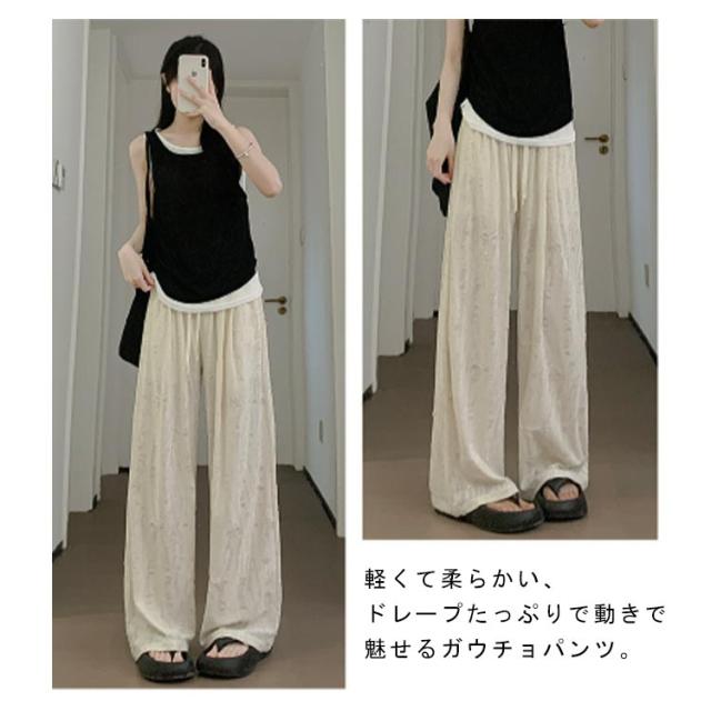 ワイド ワイドパンツ ダメージ加工 ダメージ加工 ウェストゴム 蝶柄 無地 バギーパンツ ガウチョパンツ レディース ブーツカット ロングパンツ クラッシュ 9分丈 パンツ ポケット付き 春 夏