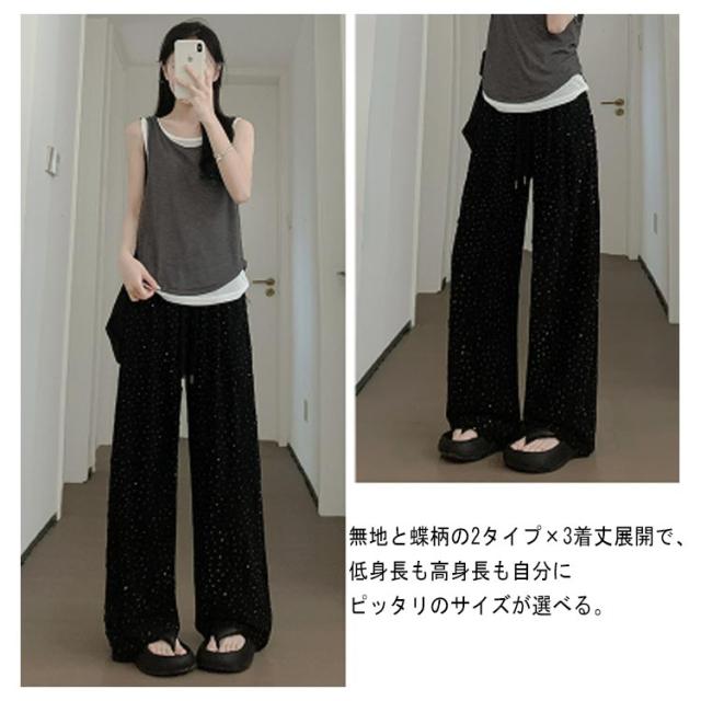 | 着映えすること間違いなし ビジュー付きダメージ加工ワイドパンツ。 軽くて柔らかい、ドレープたっぷりで動きで魅せるガウチョパンツ。 毎日のコーデを一気に格上げしてくれるビジューワイドパンツ。 無地と蝶柄の2タイプ×3着丈展開で、低身長も高身長も自分にピッタリのサイズが選べる。 個性あふれるダメージ加工、存在感抜群! | |
