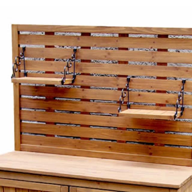背面パネルに付属の吊り棚を掛けるだけで、よく使う園芸用品や掃除グッズをすっきり収納できます。吊り棚は交互に設置できるため、実用性はもちろん、見た目にもおしゃれな印象を演出します。