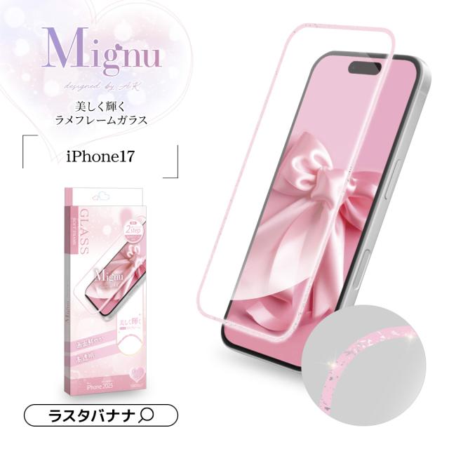 【送料無料】iPhone17 ガラスフィルム 全面保護 高光沢 高透明 クリア Mignu キラッと輝くラメフレーム ソフトフレーム 貼付革命 貼り付け革命 瞬間貼り 失敗しない レボリューション 0.28mm 硬度10H ミニュ ピンク アイフォン17 保護フィルム SG5125IP5A ラスタバナナ
