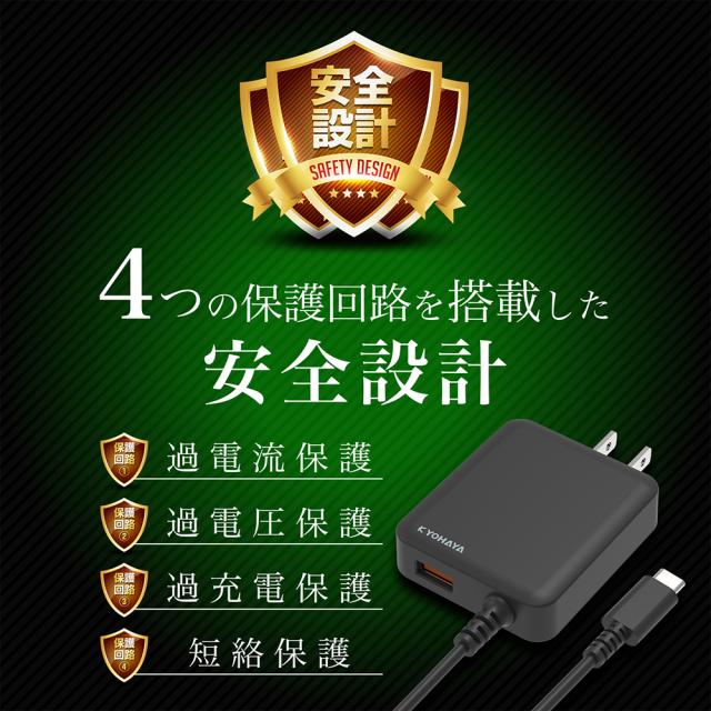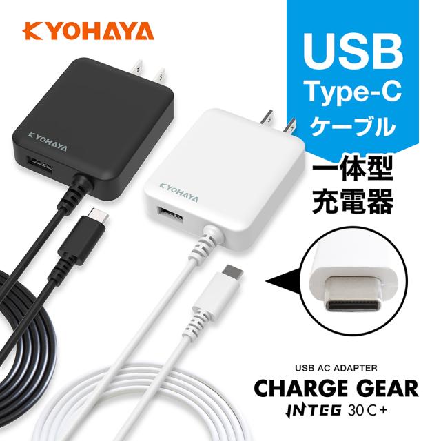 USB 充電器 30W出力 タイプC 1.5m PD QC 急速充電 コンセント ノートPC アンドロイド スマートフォン ACアダプター ケーブル 一体型 薄型 USB-Aポート搭載 2台同時充電 KYOHAYA JKAC3015C30