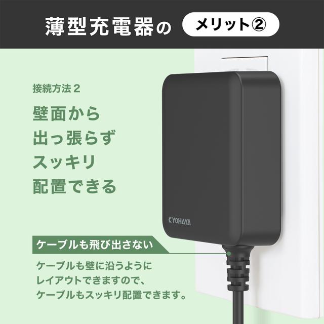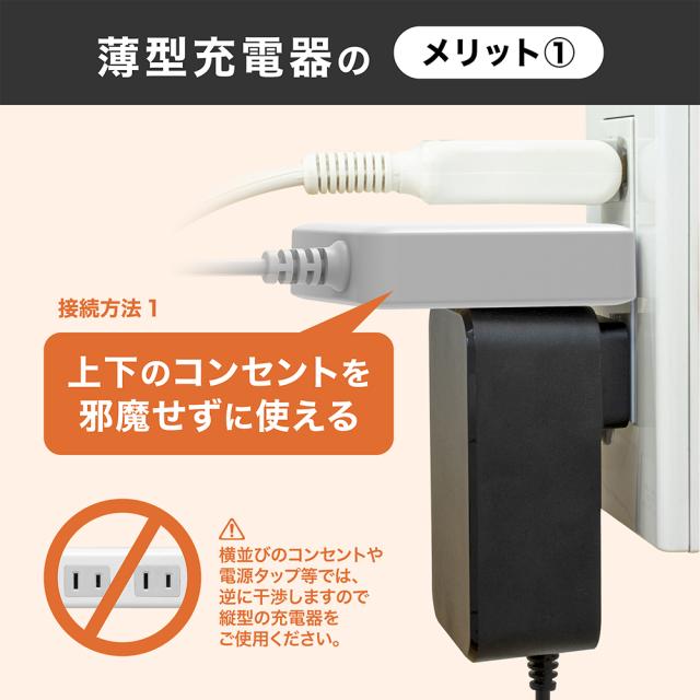 | 上下のコンセントを邪魔せずに使える薄型充電器の中でも極薄な厚さ17mm。ケーブルも一体型なので荷物が増えず持ち運びに最適です。 |