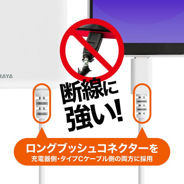 | USB Type-C ケーブルが充電器と一体型になっているので、これ1つでUSB Type-C端子搭載のスマートフォン等の充電が可能です。 |