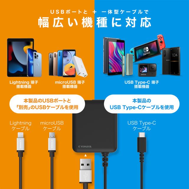 | 本製品のUSB Type-C ケーブルを使用してUSB Type-C端子搭載機器に、USBポートと別売ケーブルを使用することで、Lightning端子搭載のiPhoneなどのApple製品、microUSB端子搭載のモバイルバッテリーなど、幅広い機器に対応します。 |