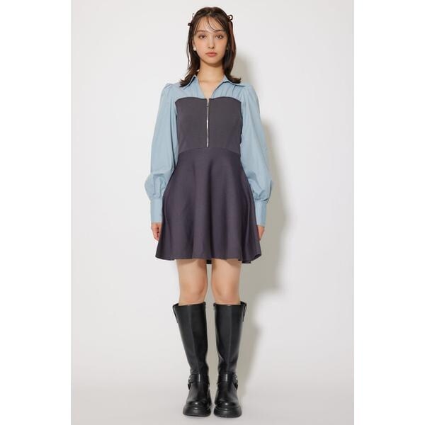 【キレイも可愛いも叶うドッキングKnitOP】【Design】少し大きめのシャープな襟がポイントのシャツをレイヤードしたように見えるニットミニワンピースです。フロントの金属ZIPがモードカジュアルな印象を演出。フレアのボリュームは幼い印象にならないよう絶妙な分量で作成しました。ブラウスの肩幅を内側に設定し華奢見え効果も叶えます。袖もボリューム感も損なわないよう、OUTERの気安さも考え作成したので様々なアウターとの合わせが可能です。【Color】定番のBLK×WHT(シャツ)、柔らかい印象のBRN×WHT(シャツ)、カジュアルライクなBLU×L/GRY(シャツ)の3色展開です。■透け感:なし■光沢感:なし■伸縮性:シャツなしワンピースあり■裏地:なし