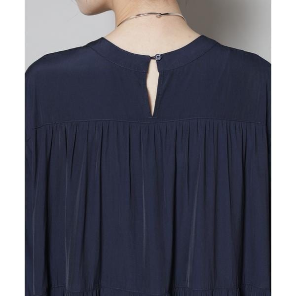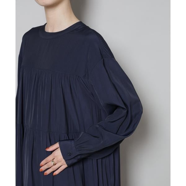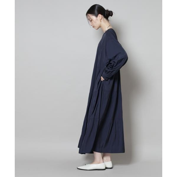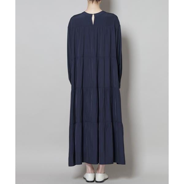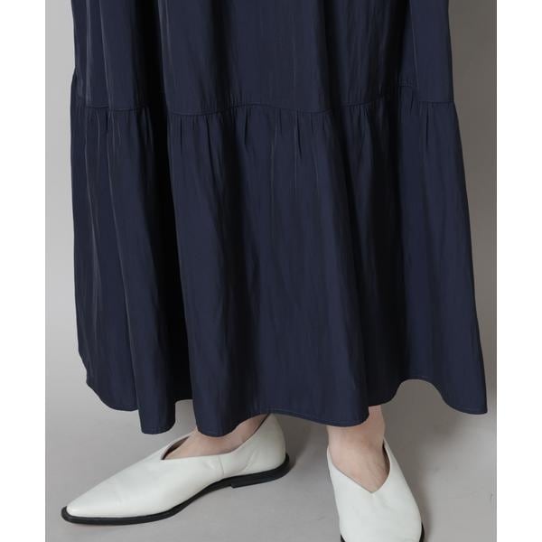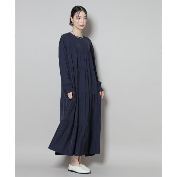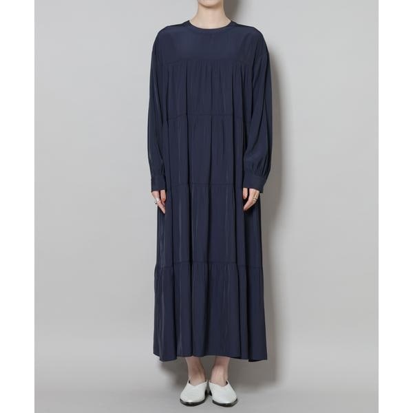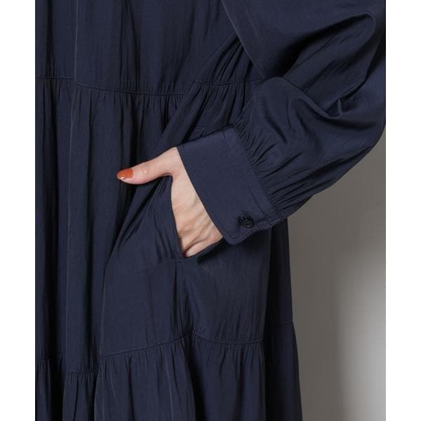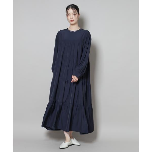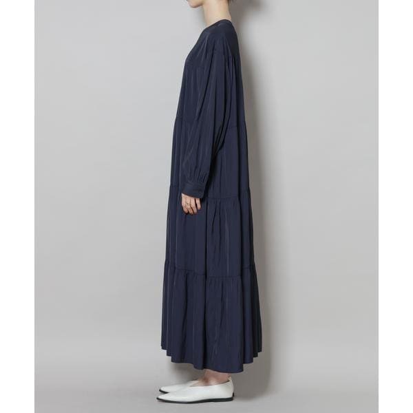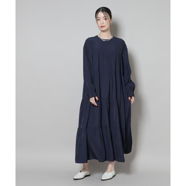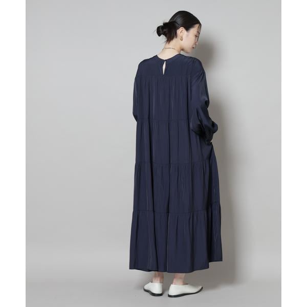 上品な艶と、揺れるシルエットが一枚で着映えするマキシ丈ワンピース。ボリューム感のある華やかなティアードデザインが女性らしさを引き立ててくれる一着です。