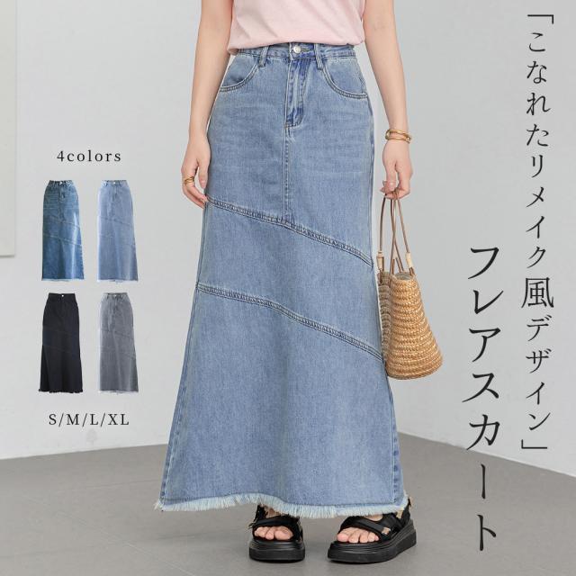「こなれた斜め切り替え」デニム スカート 大人 ロング Aライン フレアスカート ボトムス レディース 裾 フリンジ 斜め切り替え マーメイド シルエット ボタン ファスナー ハイウエスト ベルトループ ポケット 中厚手 デイリー 黒 春夏 秋冬