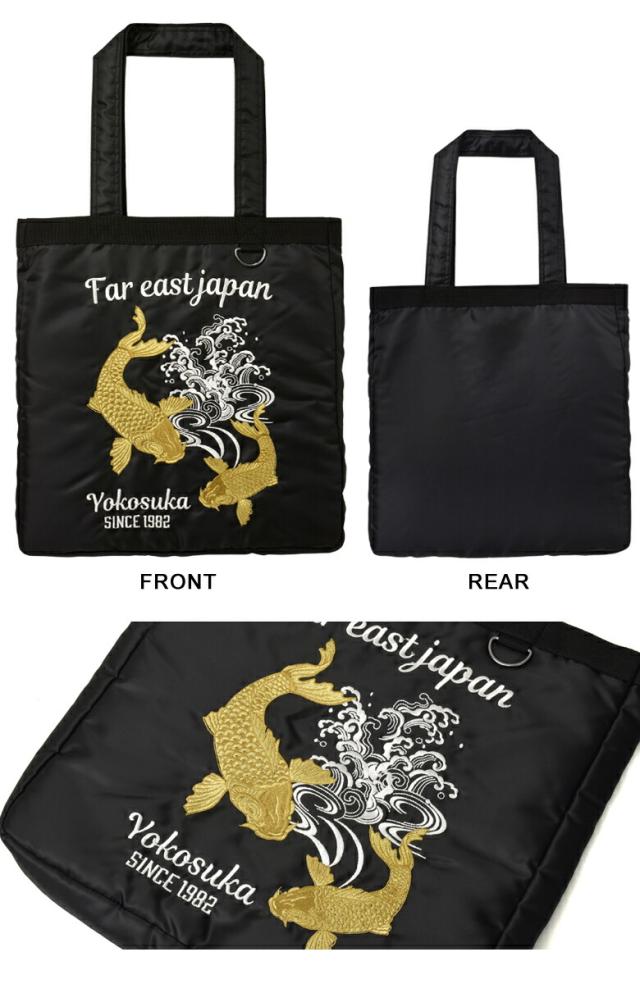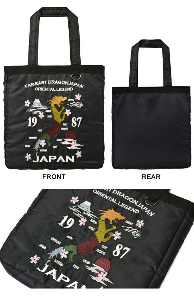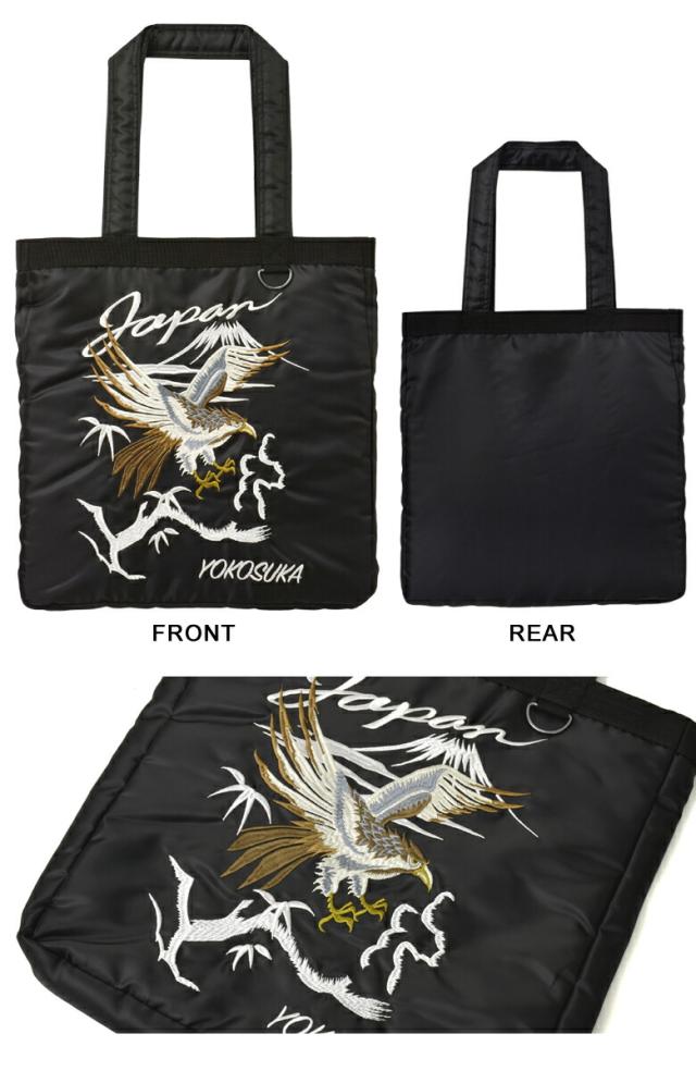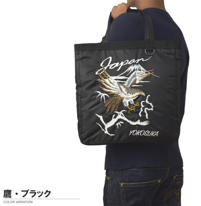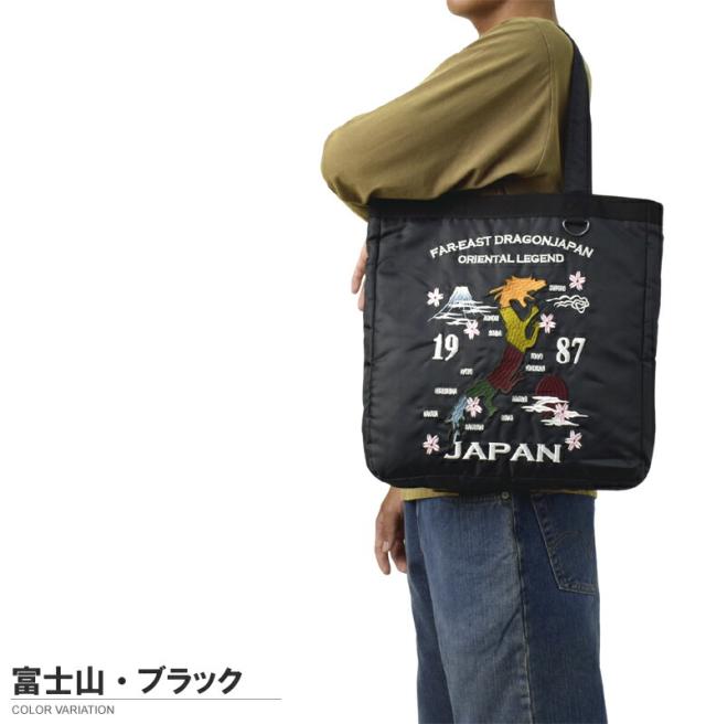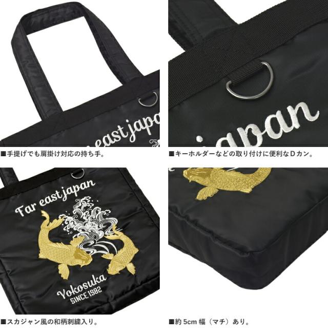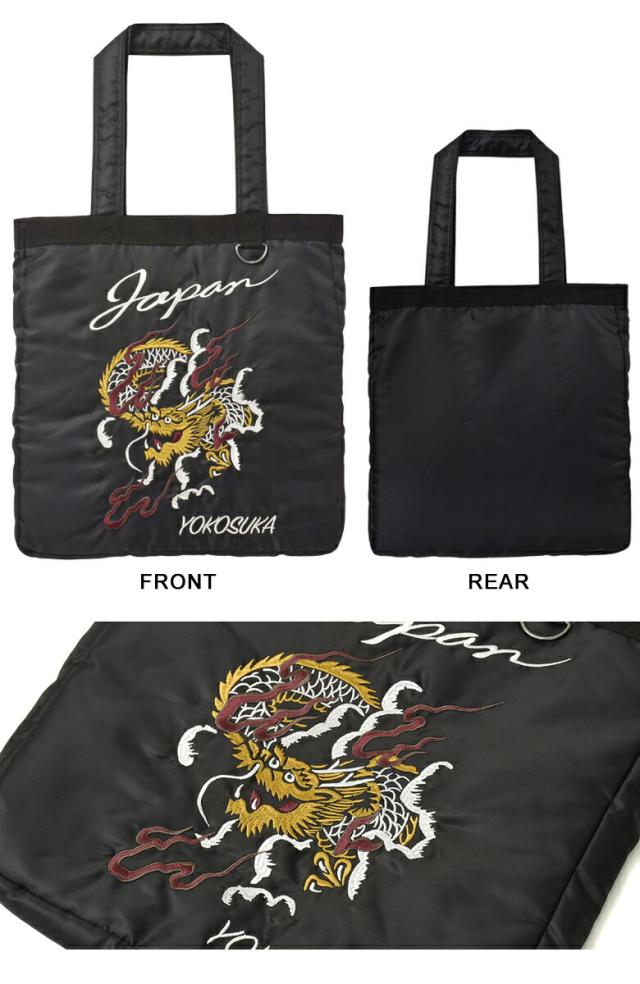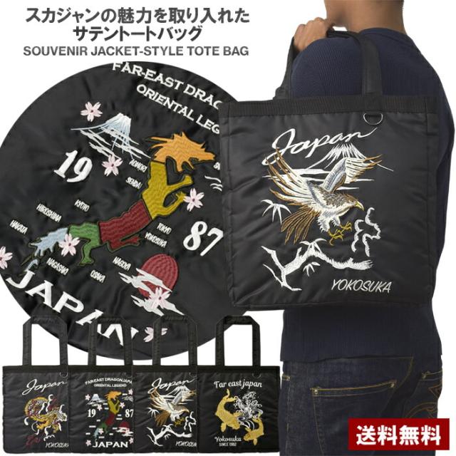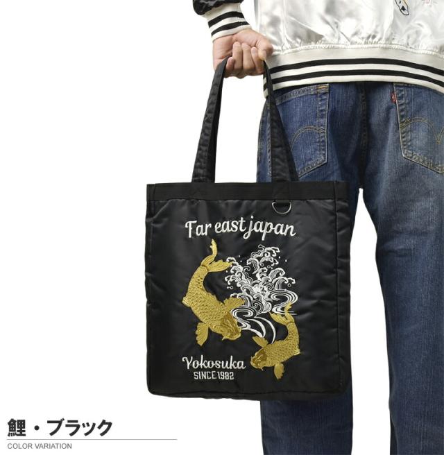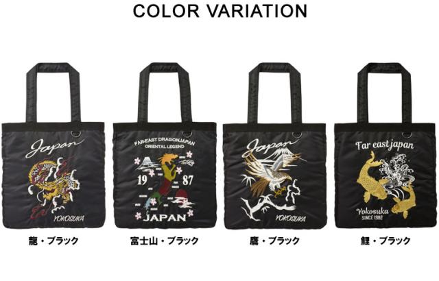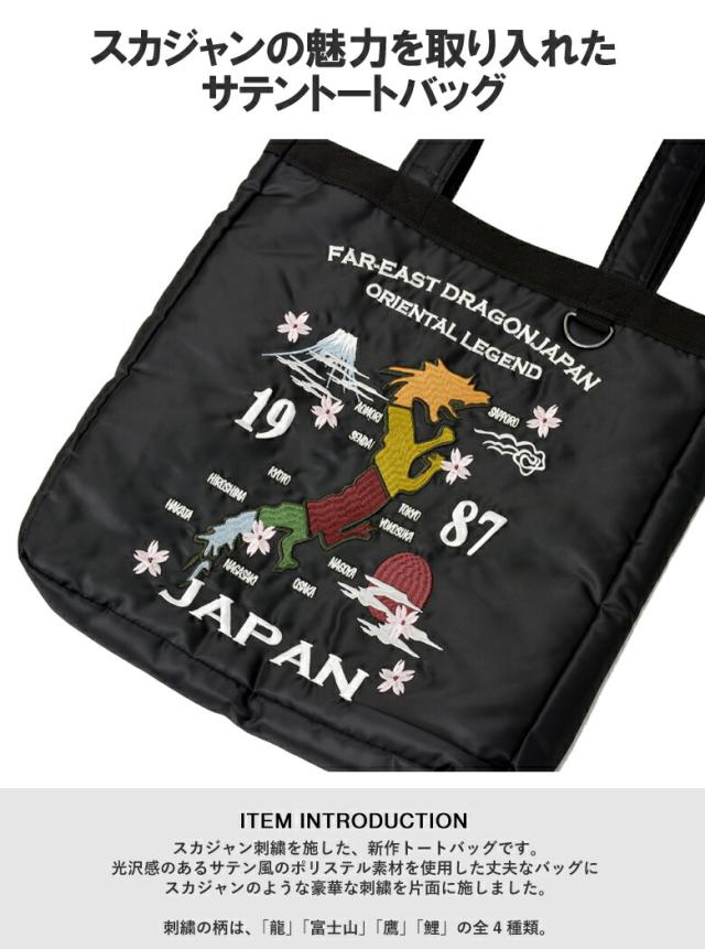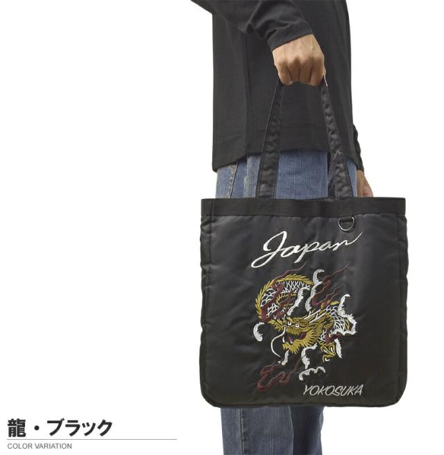 バッグ トートバッグ エコバッグ ナイロンバッグ 手さげカバン 手提げバッグ スカジャン 刺繍 龍 富士山 鷹 鯉 和柄 横須賀 サテン A4サイズ ブラック ミリタリー カジュアル【Z9I】【パケ1】【A】