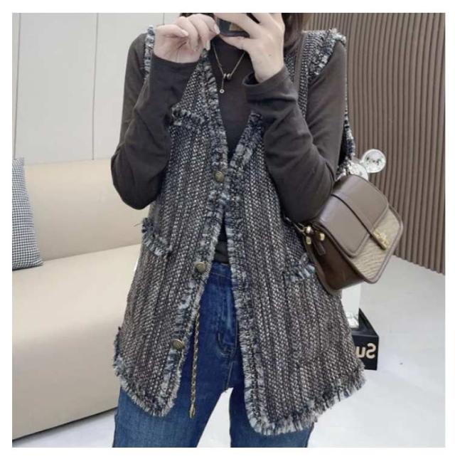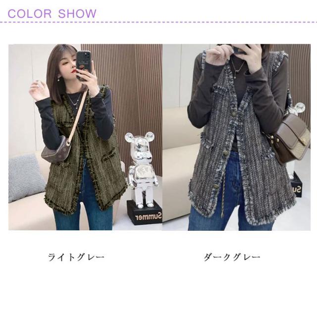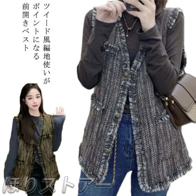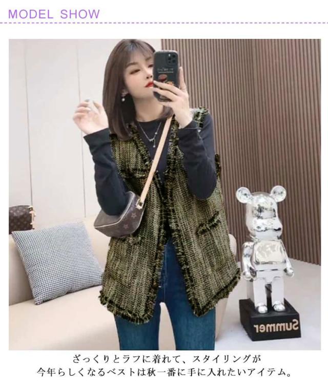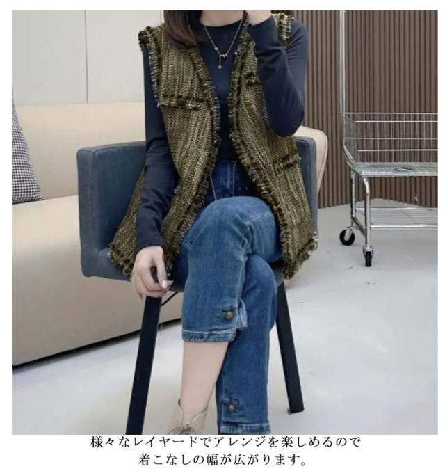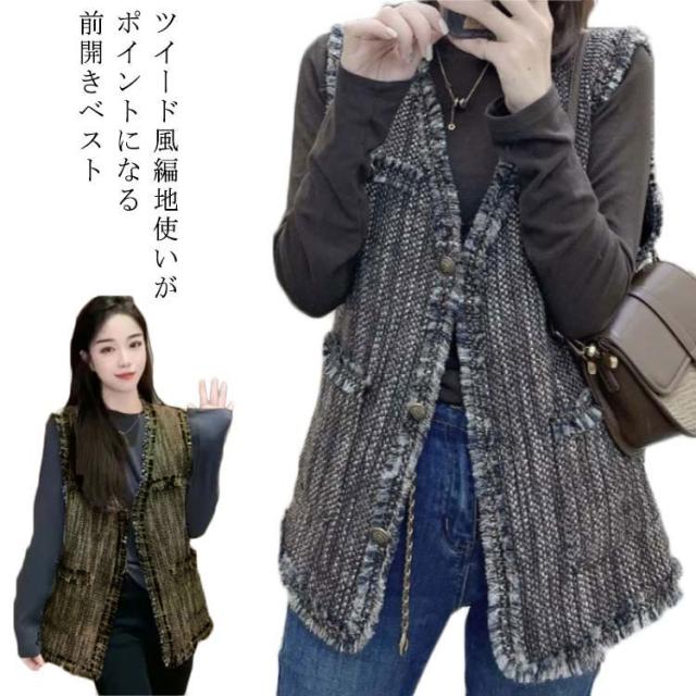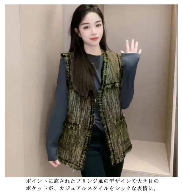 ベスト レディース ツイード ジレ ツイードベスト 前開きベスト Vネック ノースリーブ ジャケット フリンジ ミドル丈 羽織 韓国ファッション 上品 エレガント オフィス カジュアル 春 秋 冬 送料無料