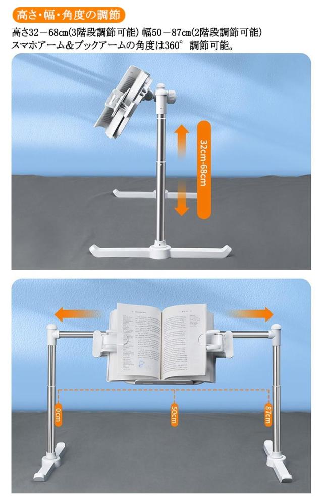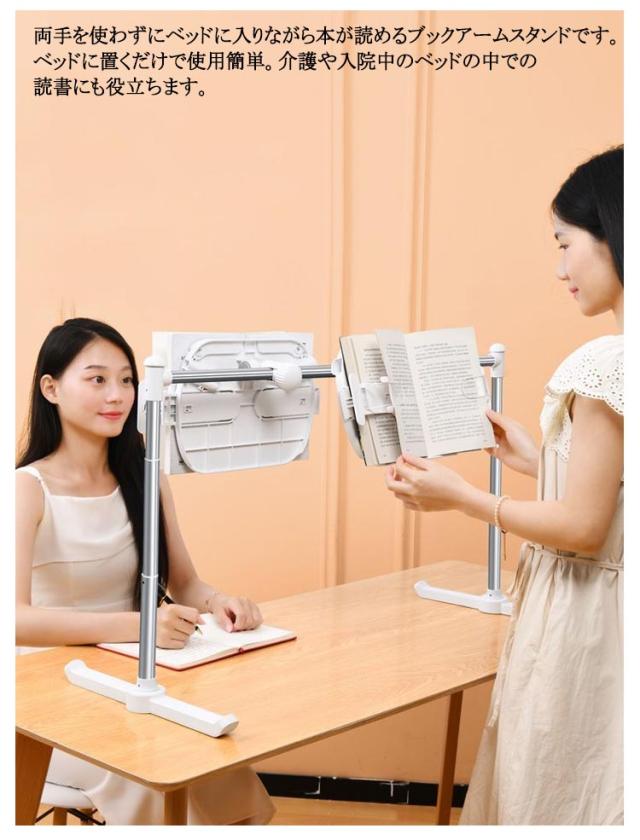 | 寝ながら読書・スマホやタブレット使用可能なベッド用スタンド。【スマホアーム+ブックアーム2個付き】 【小説から大判雑誌、スマホ・タブレットに対応】 スマホアーム&ブックアーム付きで、読書とスマホやタブレットの使用は同時に使える。幅広いサイズの本に対応しています。ブックスタンド本体が本を固定するための可動域は29cm?48cm。小説から大判雑誌まで置くことが可能です。 【ページをめくる時以外両手はフリー】 ページをめくる時以外は両手はフリーです。手や腕、首、肩に負担をかけることなく読書を楽しむことができます。ブックスタンドには2つのプラスチック製のクリップが付属しています。 どうな厚い本でも、平らに広げることができます。 (800p程度まで) 【高さ・幅・角度の調節】高さ32?68cm(3階段調節可能) 幅50?87cm(2階段調節可能) スマホアーム&ブックアームの角度は360°調節可能。 両手を使わずにベッドに入りながら本が読めるブックアームスタンドです。ベッドに置くだけで使用簡単。介護や入院中のベッドの中での読書にも役立ちます。 | |