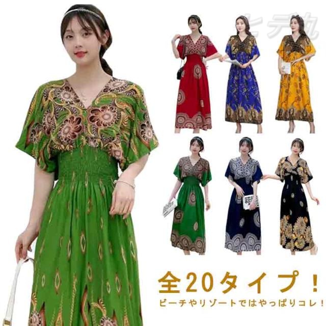 柔らかい エキゾチック 総柄 リゾート 花柄 リゾートワンピース おしゃれ ワンピース 半袖 ロング丈 ロング Vネック マキシ丈 夏 アジアン マキシワンピース 個性的 海 リゾートワンピース きれいめ エスニック 花柄 沖縄 海外旅行 体型カバー ゆったり 着?せ ギフト