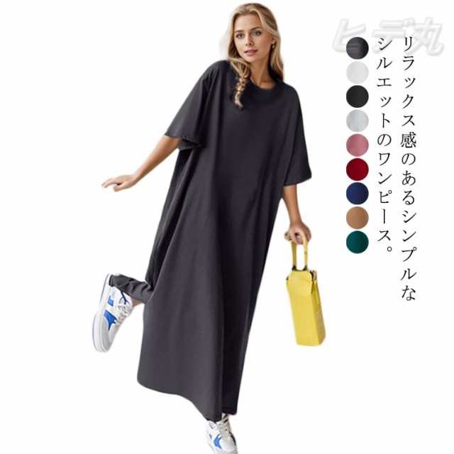 Tシャツ 半袖 レディース ワンピース ロングワンピース 夏 ロング ゆったり Tシャツ 体型カバー クルーネック 細見え 着痩せ きれいめ 韓国ファッション キレイめ