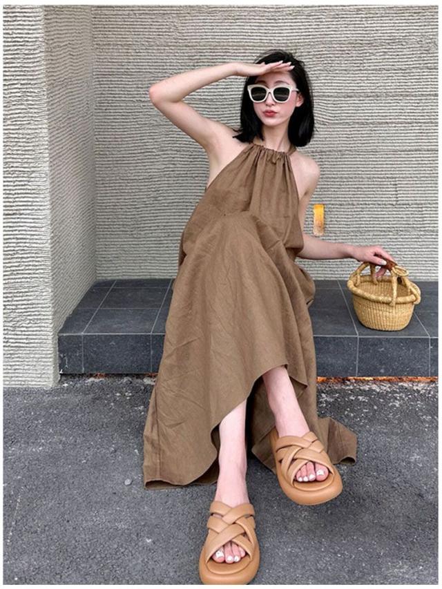 ホルターネック ロング丈 ノースリーブワンピース フレアワンピース リゾートワンピース 韓国風 Aライン サマードレス 薄手 無地 ロングワンピース マキシワンピース 海 夏 レディース 2023新作