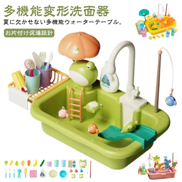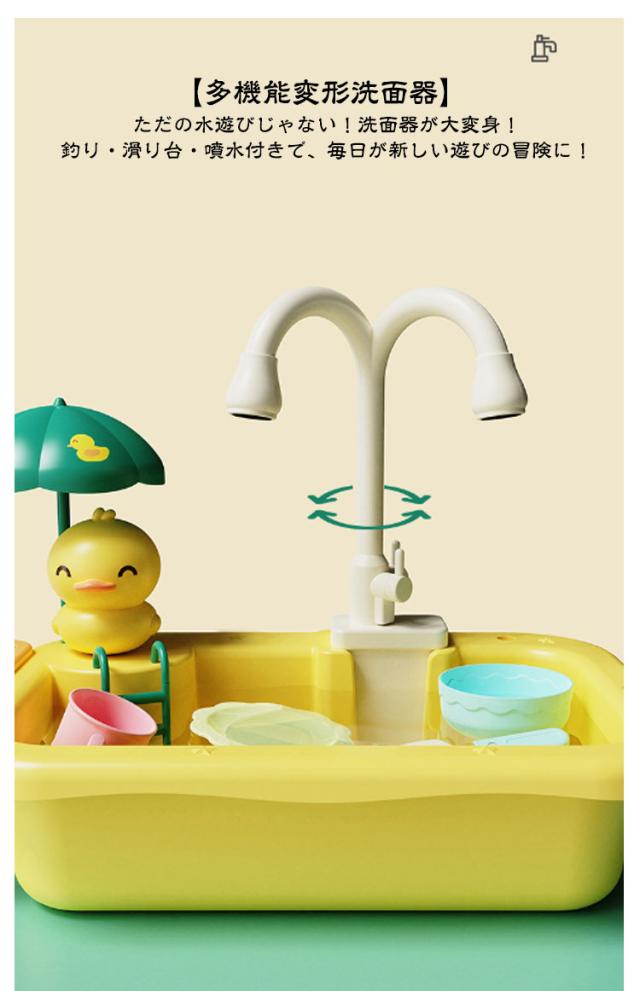 | 夏に欠かせない多機能ウォーターテーブル。 【多機能変形洗面器】ただの水遊びじゃない!洗面器が大変身!釣り・滑り台・噴水付きで、毎日が新しい遊びの冒険に! 【磁石で楽々釣り遊び】カラフルな魚やアヒルを「パチン!」と簡単釣り上げ!小さなお子様も安心の安全設計。 【アヒル型ウォータースライダー】水の流れと共にスイスイ滑る!手作り水流でワクワクが止まらない! 【お片付け促進設計】付属の水切りカゴが収納場所に。遊んだ後はおもちゃをぴかぴかに乾燥&整理整頓! フレッシュグリーン、サンシャインイエロー…キッチンにも遊びにも映える可愛いデザイン!お子様の大好きな色を選べる♪ | |