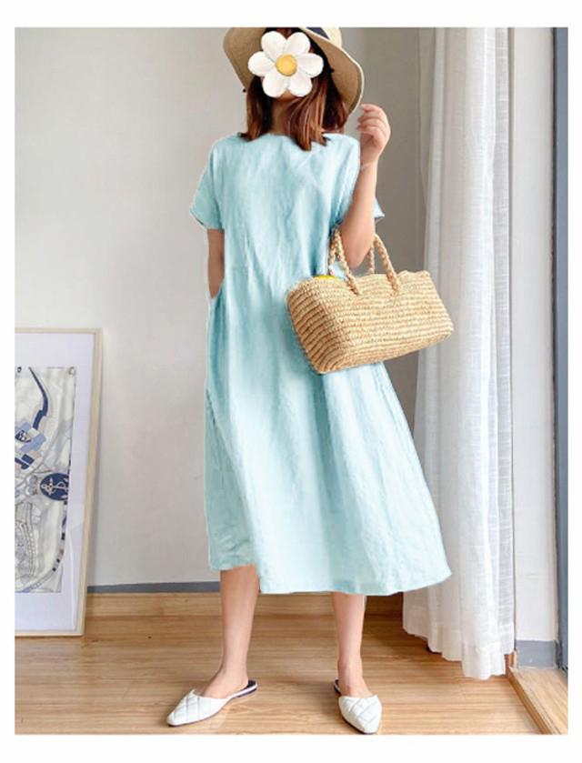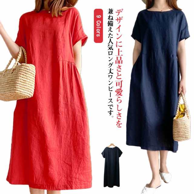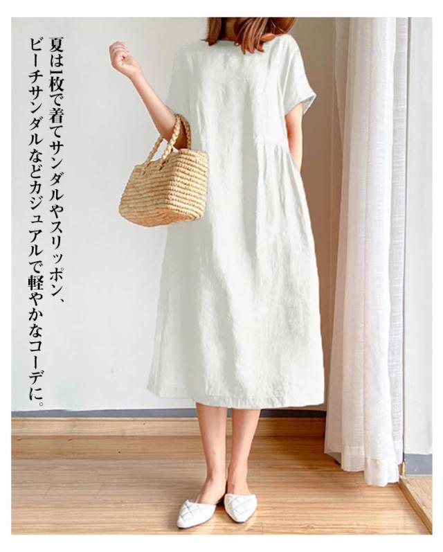 ポケット付き Aライン 夏 綿麻 春 ワンピース ロングワンピース ロング 半袖 綿麻ワンピ ミモレ丈 可愛い 涼しい プリーツギャザー 大人 着痩せ 体型カバー エレガント 大人可愛い 綿麻混 通勤