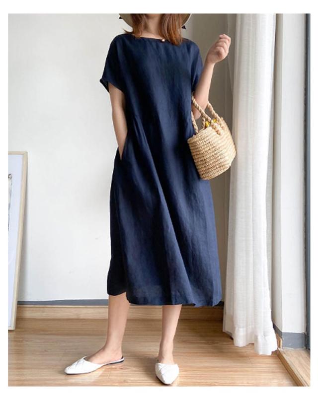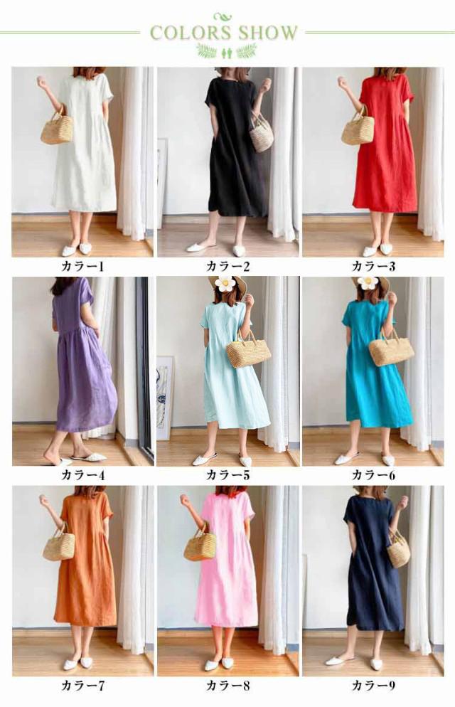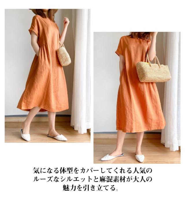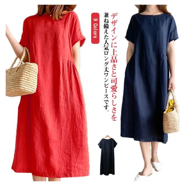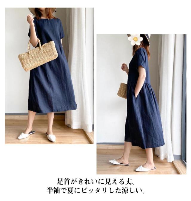 ポケット付き Aライン 送料無料 夏 綿麻 春 ワンピース ロングワンピース ロング 半袖 綿麻ワンピ ミモレ丈 可愛い 涼しい プリーツギャザー 大人 着痩せ 体型カバー エレガント 大人可愛い 送料無料 綿麻混 通勤