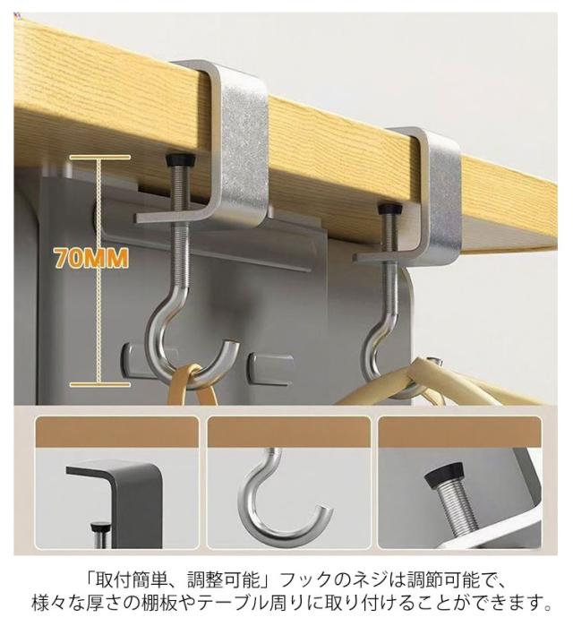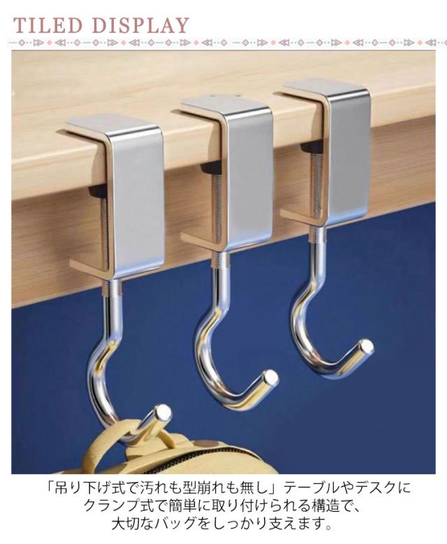 | いろいろな使い方ができるバッグハンガー4個セットです。 「吊り下げ式で汚れも型崩れも無し」テーブルやデスクにクランプ式で簡単に取り付けられる構造で、大切なバッグをしっかり支えます。 床置きを防ぐことはもちろん、椅子やテーブルのスペースを占領することありません。 「取付簡単、調整可能」フックのネジは調節可能で、様々な厚さの棚板やテーブル周りに取り付けることができます。 滑りを防ぐだけでなく、家具の表面を摩耗から保護することもできます。 | |
