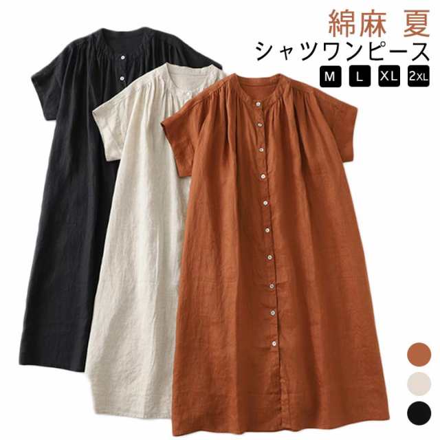 シャツワンピース 前開け バンドカラー レディース ロングワンピース ミモレ丈 シャツブラウス チュニック 綿麻 ドロップショルダー ギャザー 着痩せ 大人 シンプル ゆったり 半袖ワンピース オフィス OL 通勤