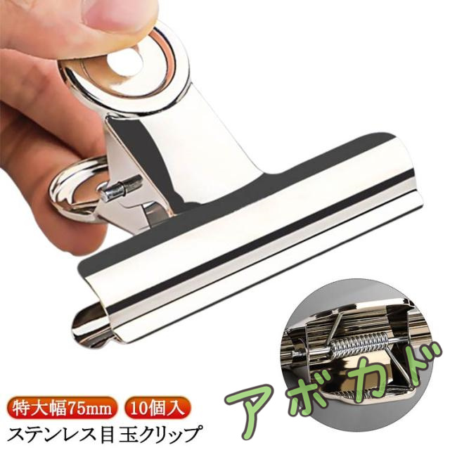 目玉クリップ 特大 幅75mm 10個入 錆ににくい ステンレス クリップ 文具 文房具 事務用品 オフィス 学校 業務用 密封クリップ 食品保存 袋止めクリップ ダブルクリップ 超強力 送料無料