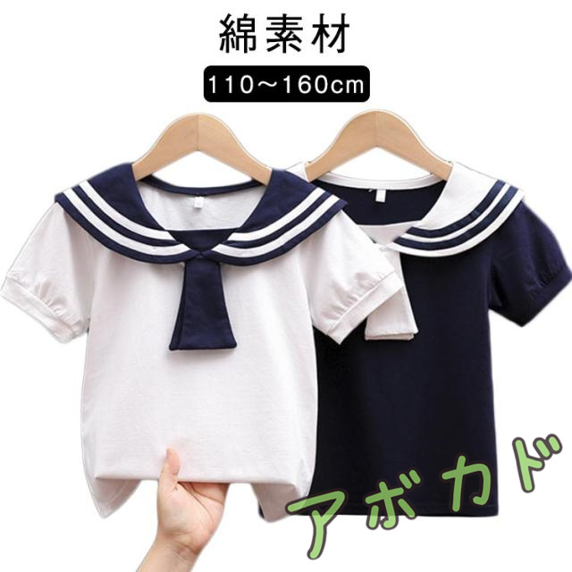 | 【110?160cm】【綿素材】 マリン風で可愛いセーラー服Tシャツ! キッズも気持ち良く着用できるよう、綿混の生地を採用 パンツもスカートもOKな、合わせるボトムスを選ばない着まわし力の高いアイテム | |