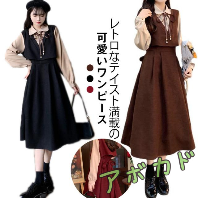 ワンピース 森ガール ロングワンピース ロング丈 着痩せ レトロ 秋 冬 膝下丈 レディース かわいい 長袖 体型カバー 女子高校生 フェイクレイヤード レディース 通勤 通学 可愛い 女子 重ね着風 大きいサイズ 着?せ ブラック レッド クリスマス ギフト プレゼント 送料無料