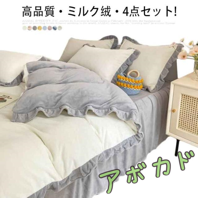 | 高品質・ミルク?・4点セット! とろけるような肌触りのミルク?生地を使用したとろけるシリーズフワさらで心地いい眠りと目覚めを。 お部屋のイメージに合わせてお好みのお色味を♪ シンプルでどんなお部屋にもあわせやすい柄なので、替えのカバーとしても最適です! フワさらで心地いい眠りと目覚めを。 その日の気分で色をチェンジ! さらっと爽やかな肌触り ふんわり・とろける触り心地のミルク?掛け布団カバー。お手持ちの掛け布団に掛けるだけで暖かくなります。 ファスナー開閉式で取り外しも楽々! 丸洗い可能でお取り扱いも簡単です。 | |