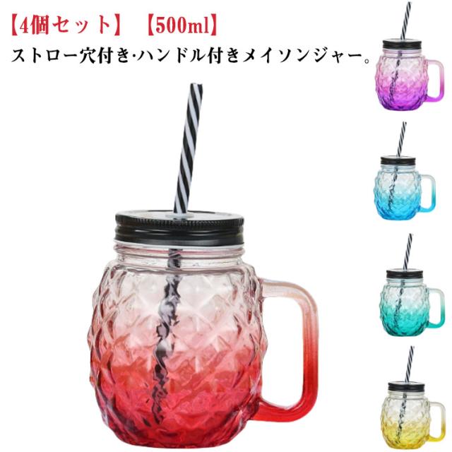 | ストロー穴付き?ハンドル付きメイソンジャー。【4個セット】【500ml】 密閉している為 氷が溶けにくく 転倒にも強い、ご家庭ではもちろん アウトドアー等にも便利です。 キャップにストロー穴を付けてドリンクボトルに改造! フタを外して、ビールジョッキとしても使える キャップ、ストローは分解して洗える。 | |