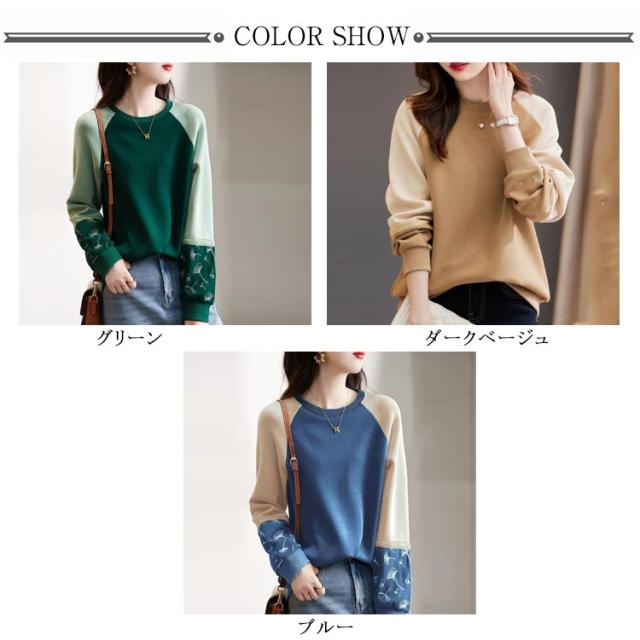 長袖 切り替え レディース レディース 袖 刺繍 春 秋 Tシャツ プルオーバーパーカー トップス ゆったり トレーナー 大きいサイズ かわいい クルーネック きれいめ