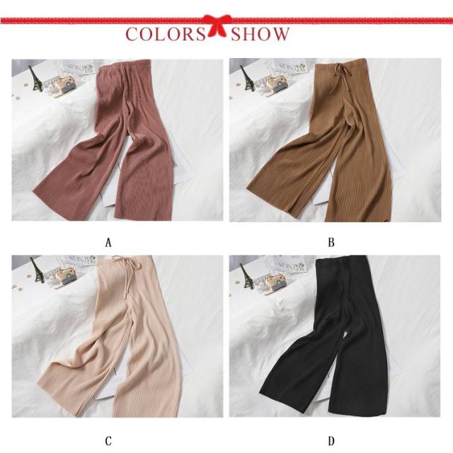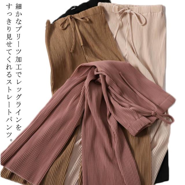 | 細かなプリーツ加工でレッグラインをすっきり見せてくれるストレートパンツ。 ウエストゴムではき心地抜群。 広がりすぎない絶妙なシルエットで、ワンピースとレイヤードしてもバランスよく着こなせます。 | |