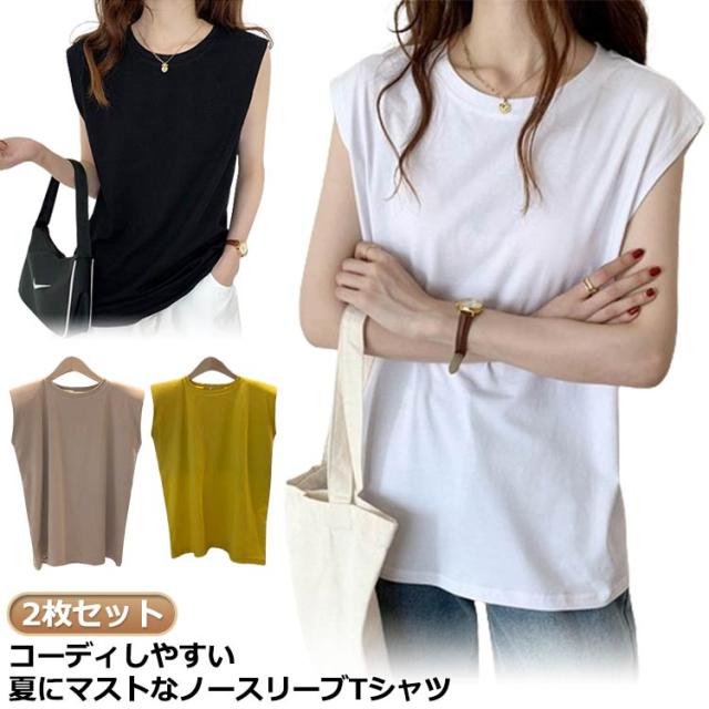 tシャツ 2枚セット!ノースリーブtシャツ レディース ノースリーブ インナー トップス 着痩せ インナー カットソー 丸首 秋 ティーシャツ 着まわし スリーブレス ゆったり クルーネック フレンチスリーブ シンプル Tシャツ 重ね着 涼しい 柔らか 春 夏 夏