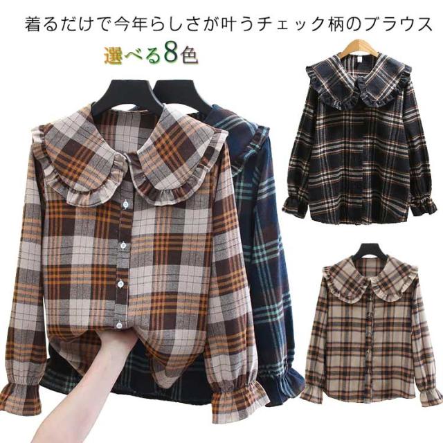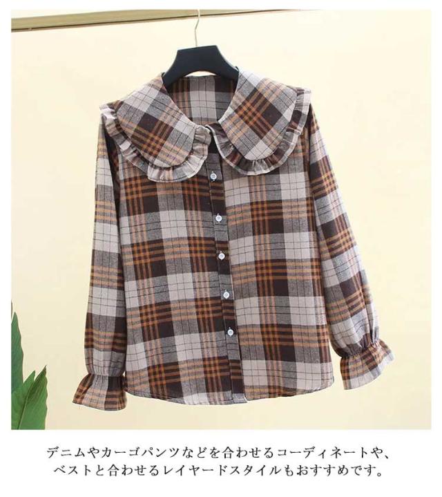 チェック柄 ブラウス レディース フリル襟 ピーターパン襟 ブラウス 長袖シャツ コットン 綿 トップス フリルカラー ビッグカラー レイヤード 重ね着 おしゃれ かわいい ゆったり 大きいサイズ カジュアル 春 夏 秋 冬 送料無料