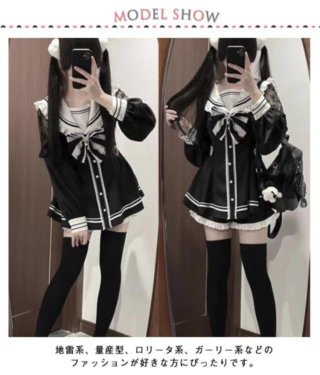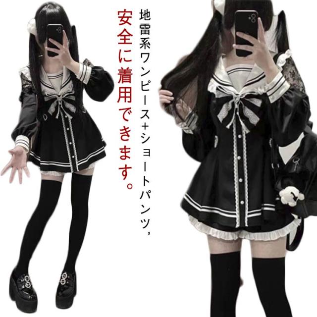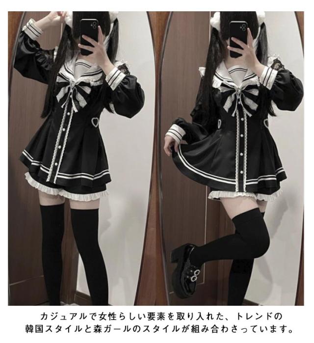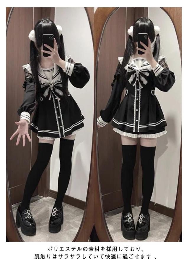 セーラーカラー 地雷系 ワンピース 2点セット 蝶ネクタイなし レディース レース リボン 蝶結び ギャル チュチュ ガール系 量産型 病みかわいい ドレス ハイウエスト ワンピース 長袖 森ガール Aライン 可愛い ロリータ 学院風 お姫様 風 春 秋 冬