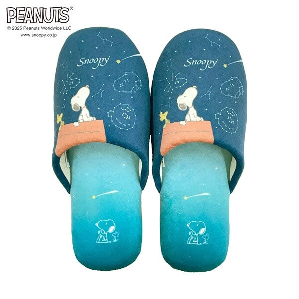 星空をテーマにした、スヌーピーたち星座が可愛いらしいデザインの、トイレ用スリッパ。星空スヌーピー、PEANUTS。星座の形にもこだわった、デザインです。洗濯機で丸洗いできるので、衛生的に使えます(ネット使用、タンブラー乾燥は不可)。