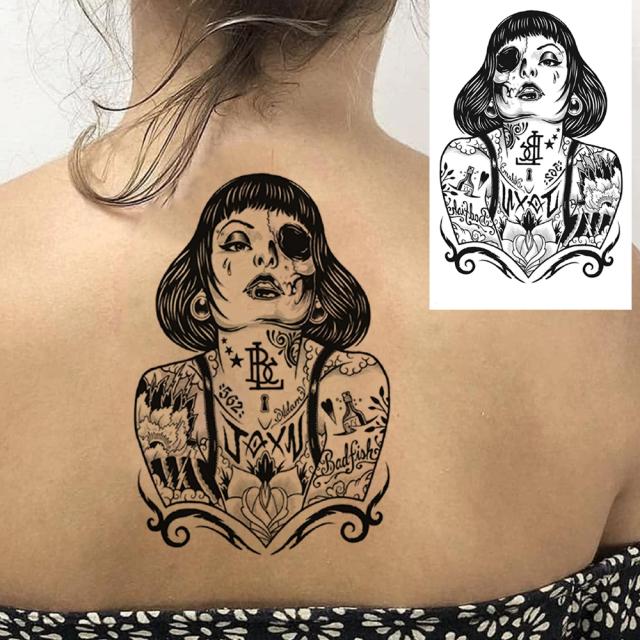 大きめフェイクタトゥーステッカーは、迫力満点の刺青を入れたドクロ顔の女性のデザインが特徴です。